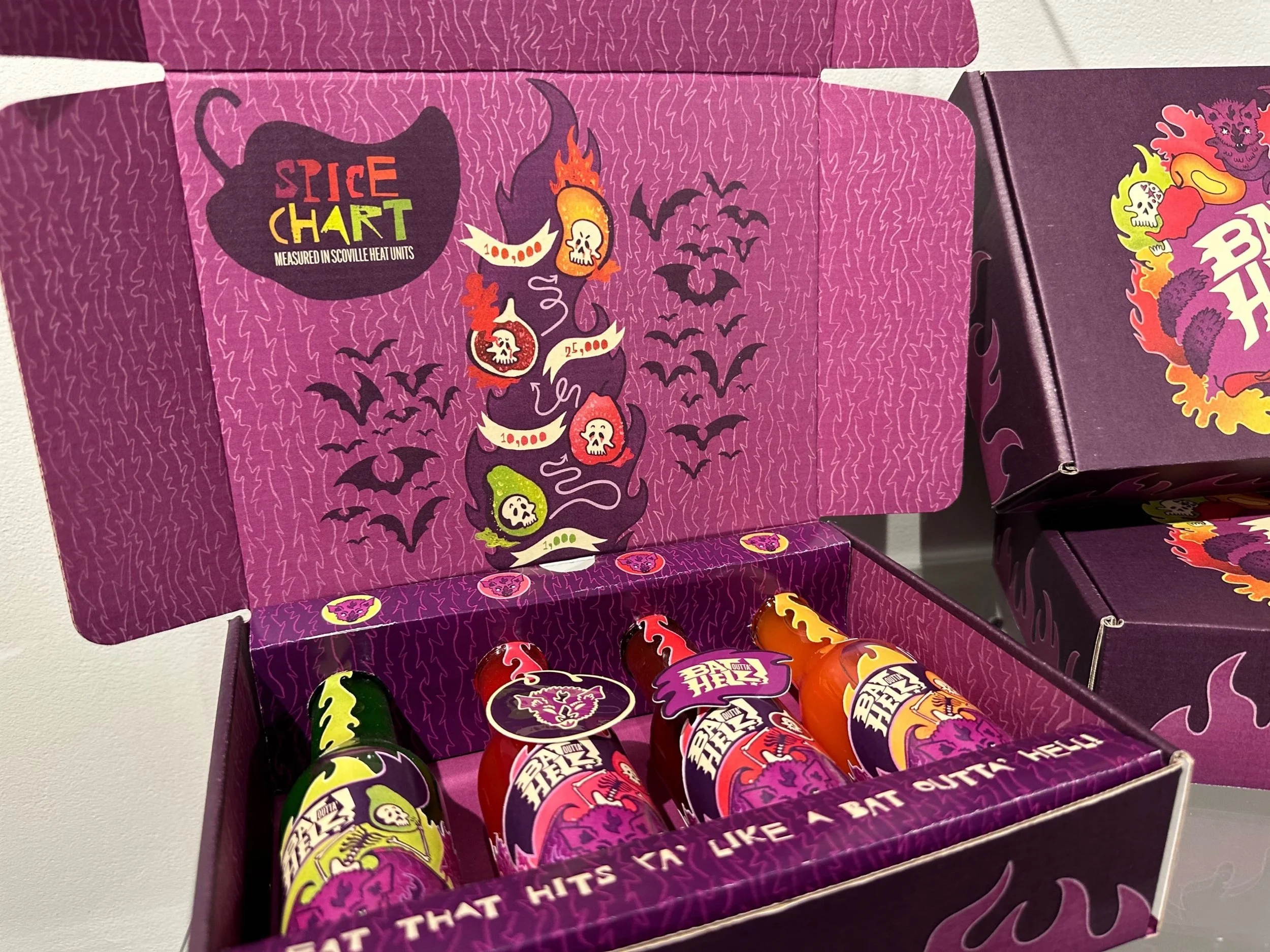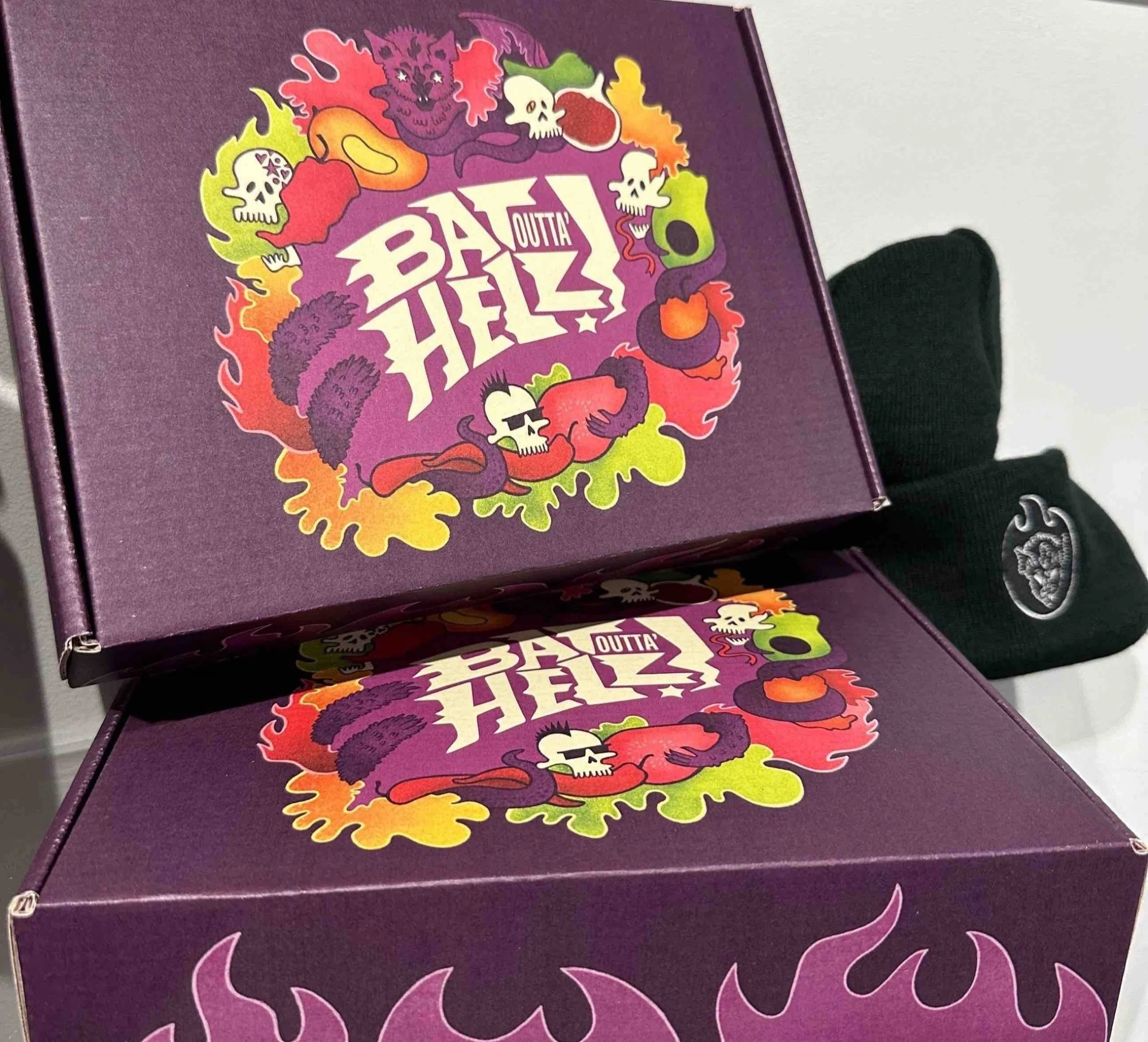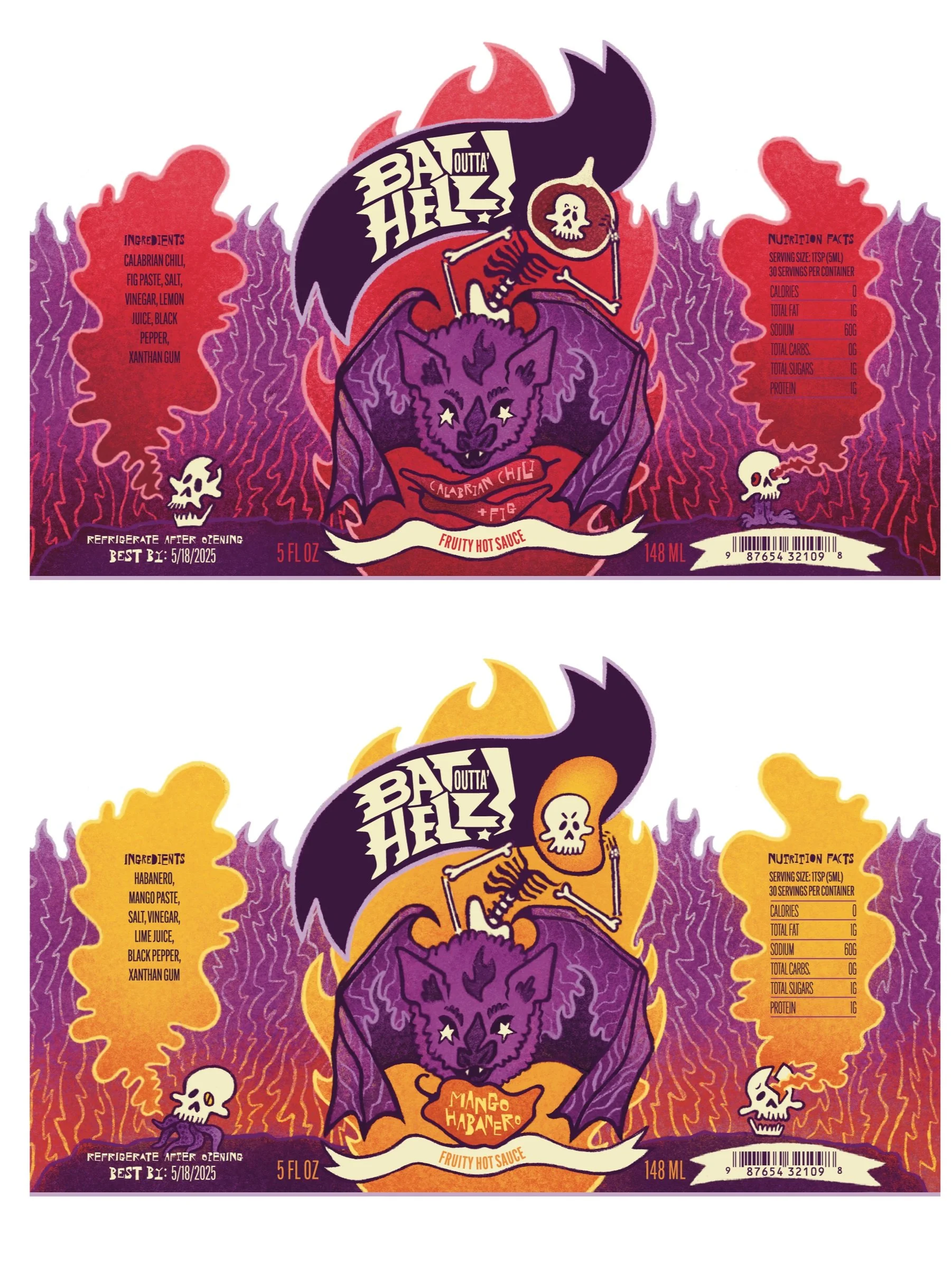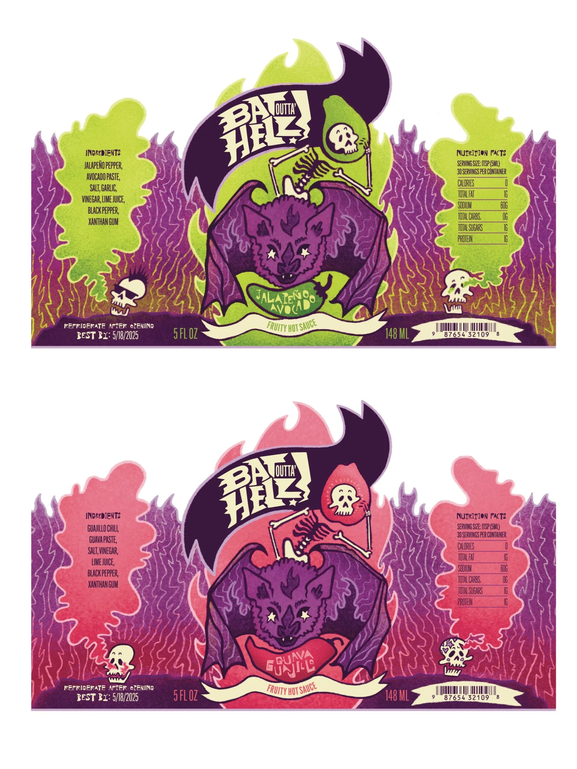 Inspired by punk imagery as well as the Jamaican fruit bat, Bat Outta’ Hell centers around 4 tropical fruits found in their diet: avocado, guava, fig, and mango. Each fruit is paired with an appropriate pepper to give the sauce the signature “hellfire” associated with the brand name.